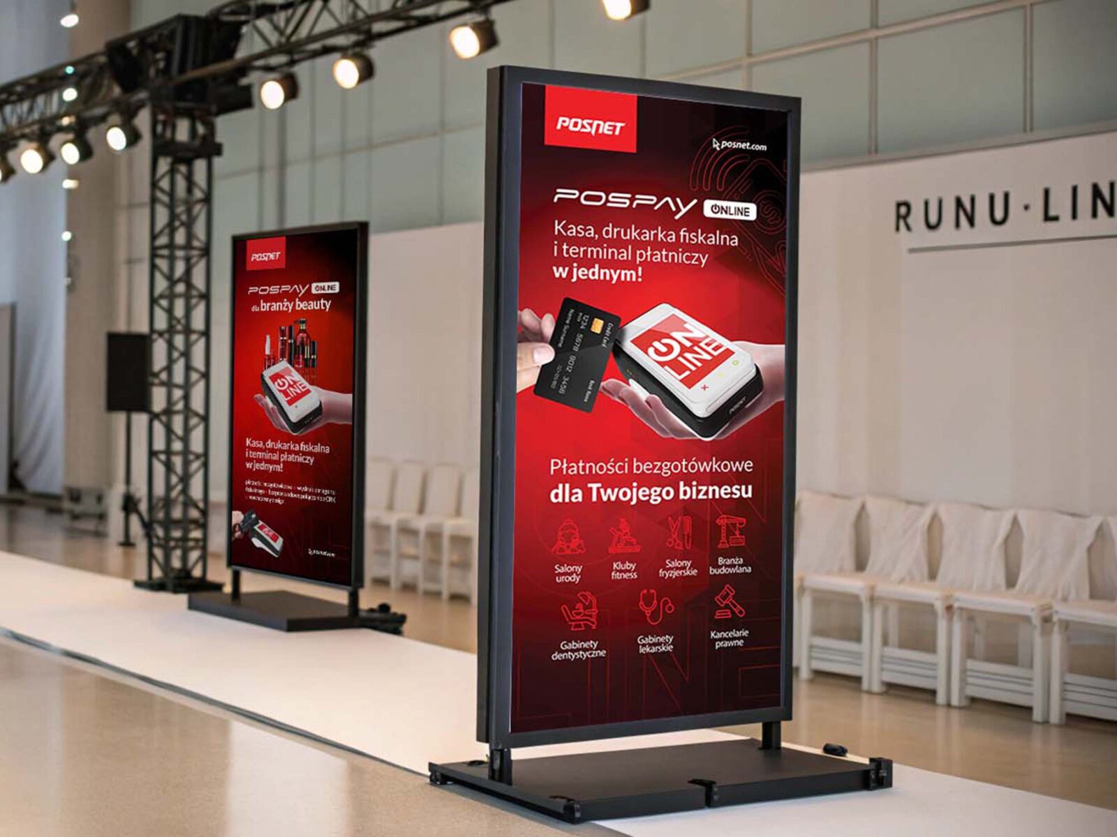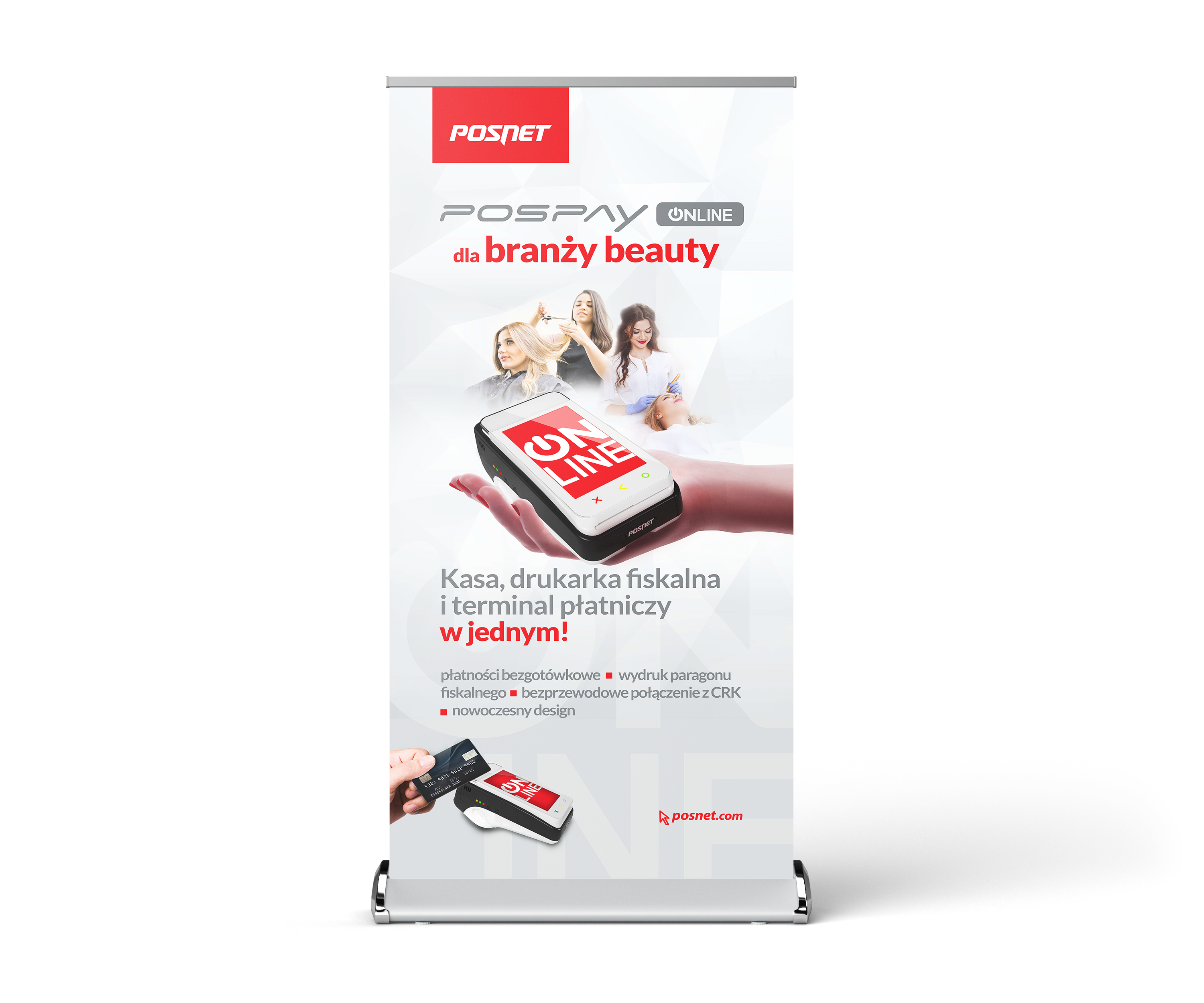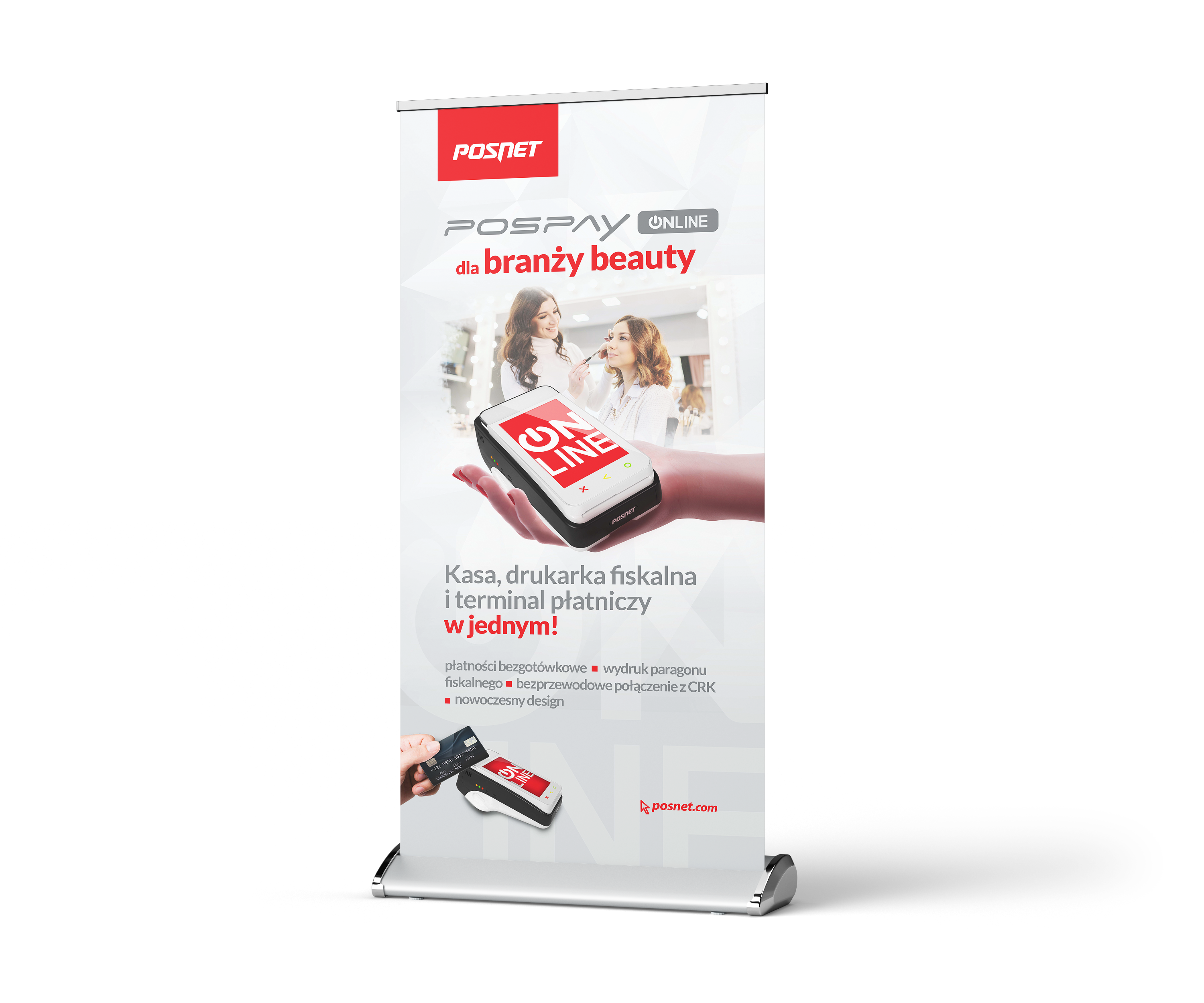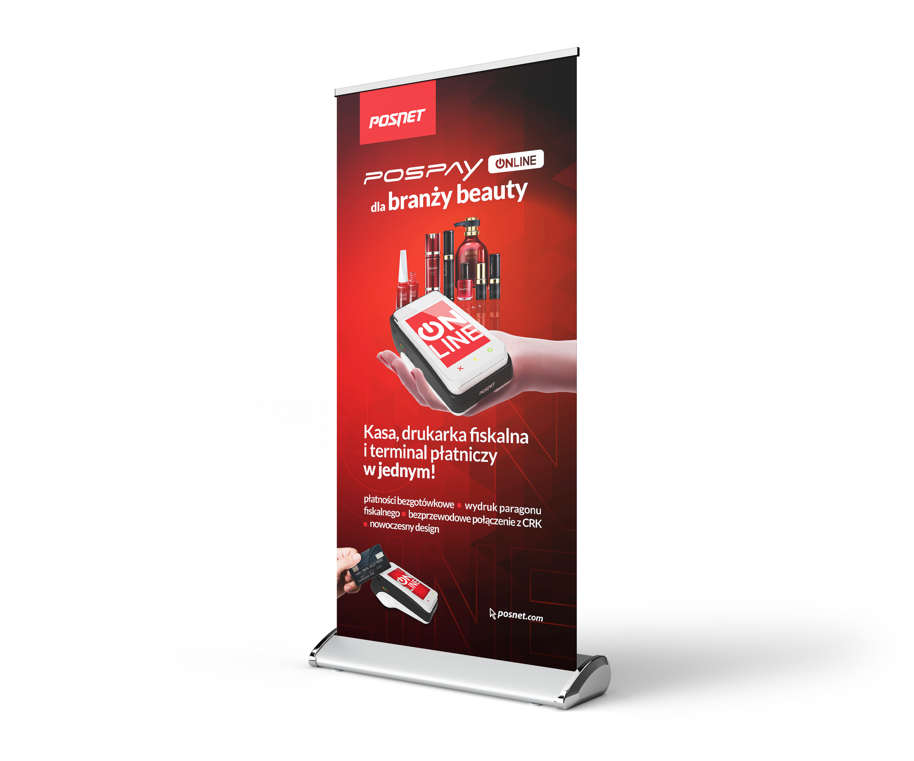 Projekt rollupów promujących urządzenie Pospay dla branży beauty – nowoczesne rozwiązanie sprzedażowe łączące kasę fiskalną, drukarkę i terminal płatniczy w jednym. Kreacja opiera się na spójnym z brandingiem firmy Posnet designie, z wykorzystaniem firmowej kolorystyki i typografii.