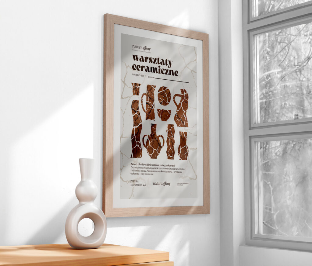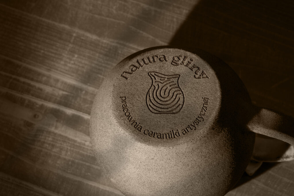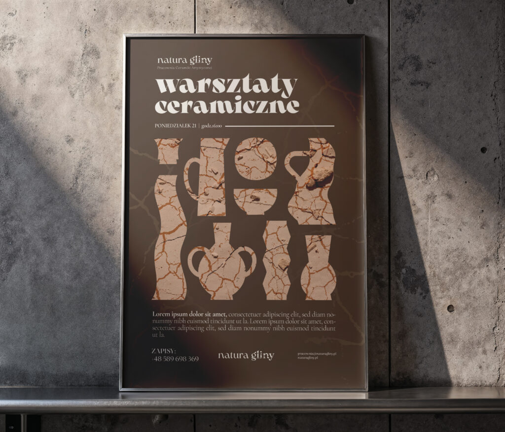 W projekcie wykorzystano paletę ziemistych, spokojnych kolorów oraz inspirowaną naturą typografię i ilustracje. Znak graficzny został osadzony w symbolice naczyń ceramicznych i linii przypominających teksturę gliny. Elementy identyfikacji – od wizytówek i opakowań, po szyld i materiały promocyjne – tworzą spójną, wyrazistą narrację wizualną.