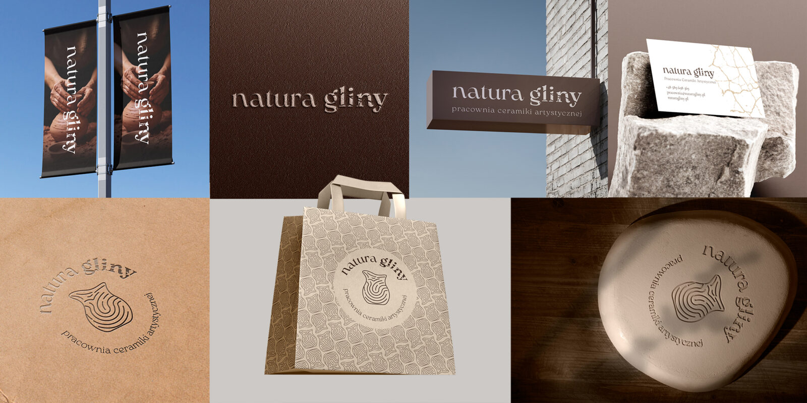 Projekt stworzony dla marki „natura gliny” to kompleksowa identyfikacja wizualna odzwierciedlająca filozofię pracy z gliną – autentyczną, ręczną i organiczną. Celem było zaprojektowanie spójnego systemu graficznego, który odda charakter pracowni, budując jednocześnie wrażenie wysokiej jakości, naturalności i kunsztu rzemieślniczego.